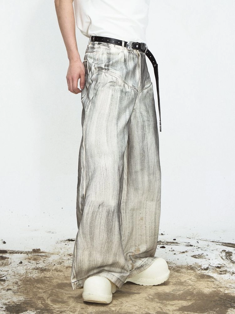 stain-brushed straight-leg wide-leg jeans