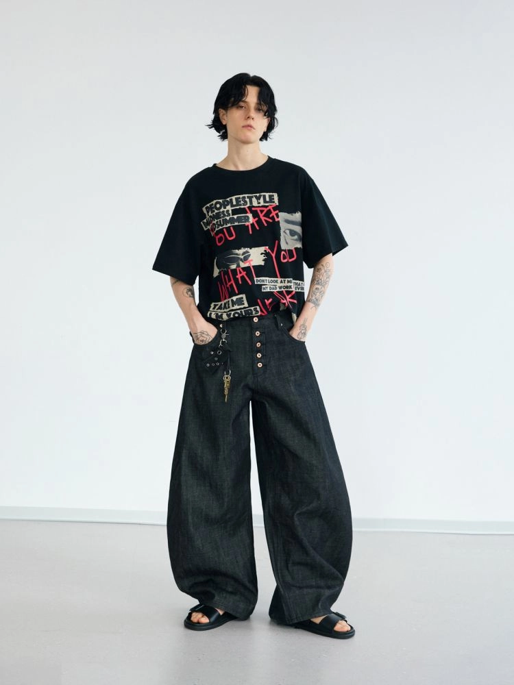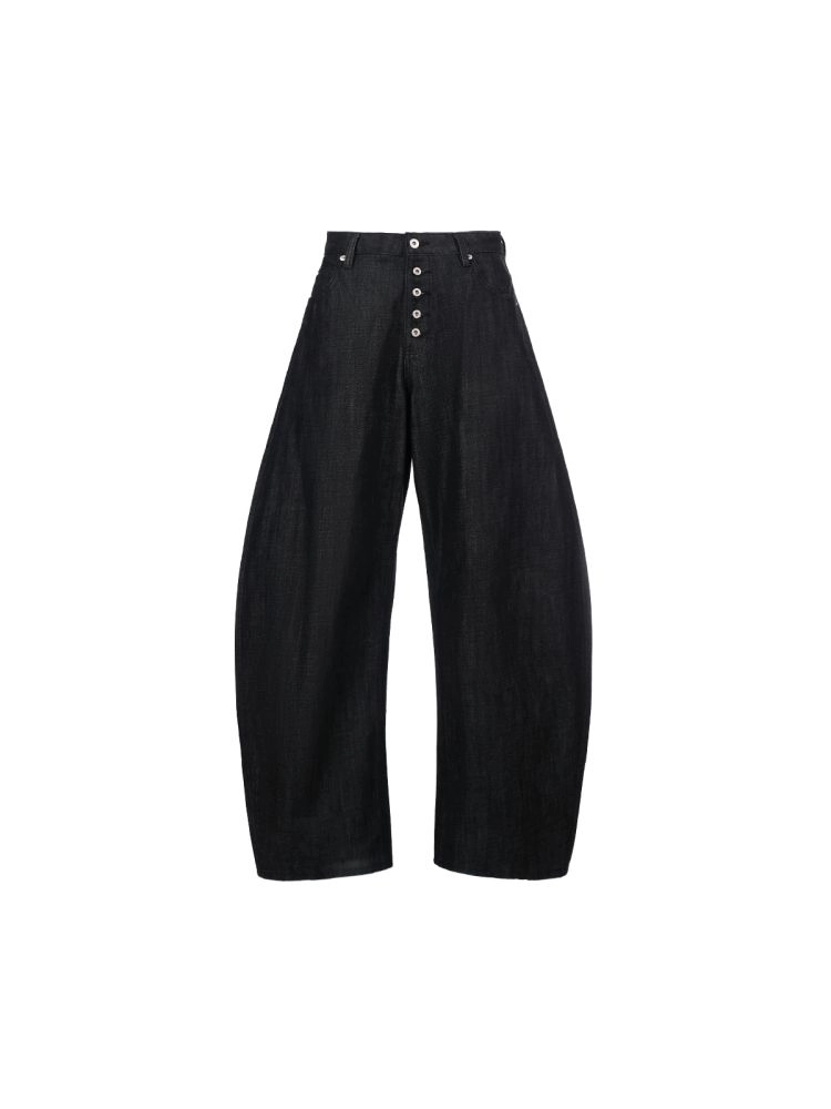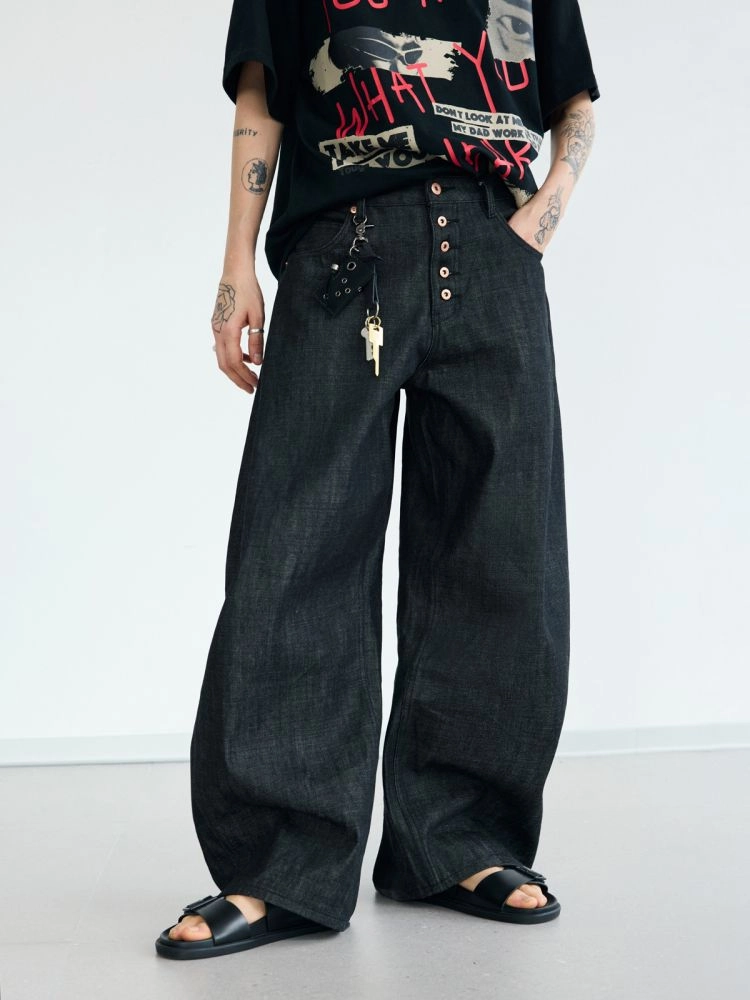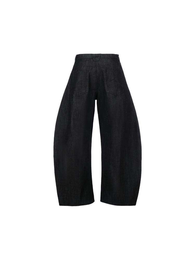 black raw denim wide-leg baggy scimitar pants